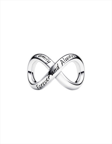 Lleva contigo vínculos eternos con nuestro Charm Infinito Para Siempre, un diseño único acabado a mano en plata de primera ley. Revelando la esencia de la familia, esta charm forma un elegante símbolo del infinito que refleja la naturaleza atemporal de esas conexiones preciadas. Este charm del infinito de Pandora captura el espíritu perdurable de la familia, que se refleja a través de dos palabras grabadas, 'Family' y 'Forever and Always' (Familia y Por Siempre y Para Siempre, en español, respectivamente). Permite a este charm recordarte que la familia es para siempre y que la alegría que se encuentra en su compañía es ilimitada.