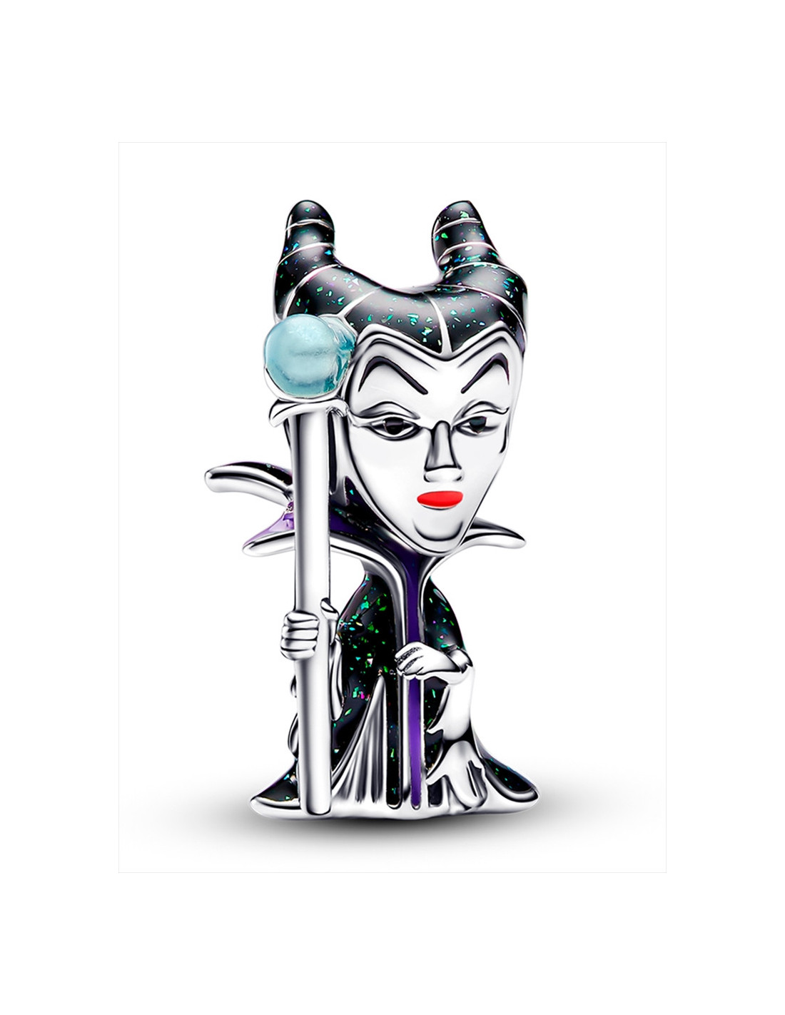 Déjate hechizar por Maléfica de Disney, que reina en sus dominios utilizando una magia oscura. Nuestro nuevo charm la representa en plata de primera ley con esmalte aplicado a mano en su capa y un cetro que brilla en la oscuridad.