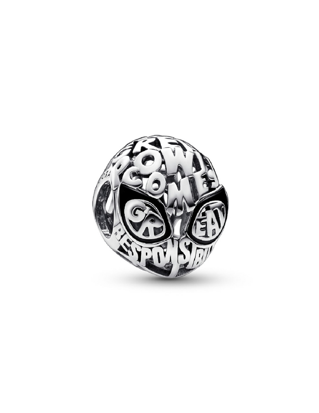Teje tu propia historia de Spider-Man con nuestro charm Máscara Spider-Man de Marvel. Elaborado en plata de ley con la forma de la máscara de Spider-Man, la parte frontal del charm lleva una fuente gráfica que deletrea el icónico recordatorio: 'With great power comes great responsibility' (Un gran poder conlleva una gran responsabilidad). La parte trasera del charm se ha decorado con detalles de telaraña en filigrana y la parte delantera con contornos de ojos esmaltados en negro. Coloca este peculiar charm en tus pulseras, pendientes o portacharms, como recordatorio de que eres increíble tal y como eres.