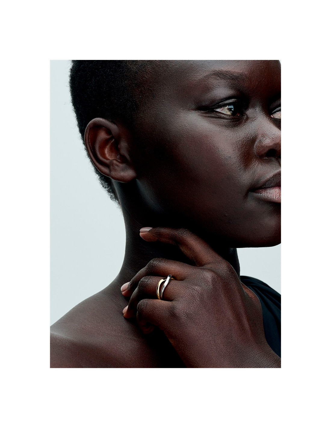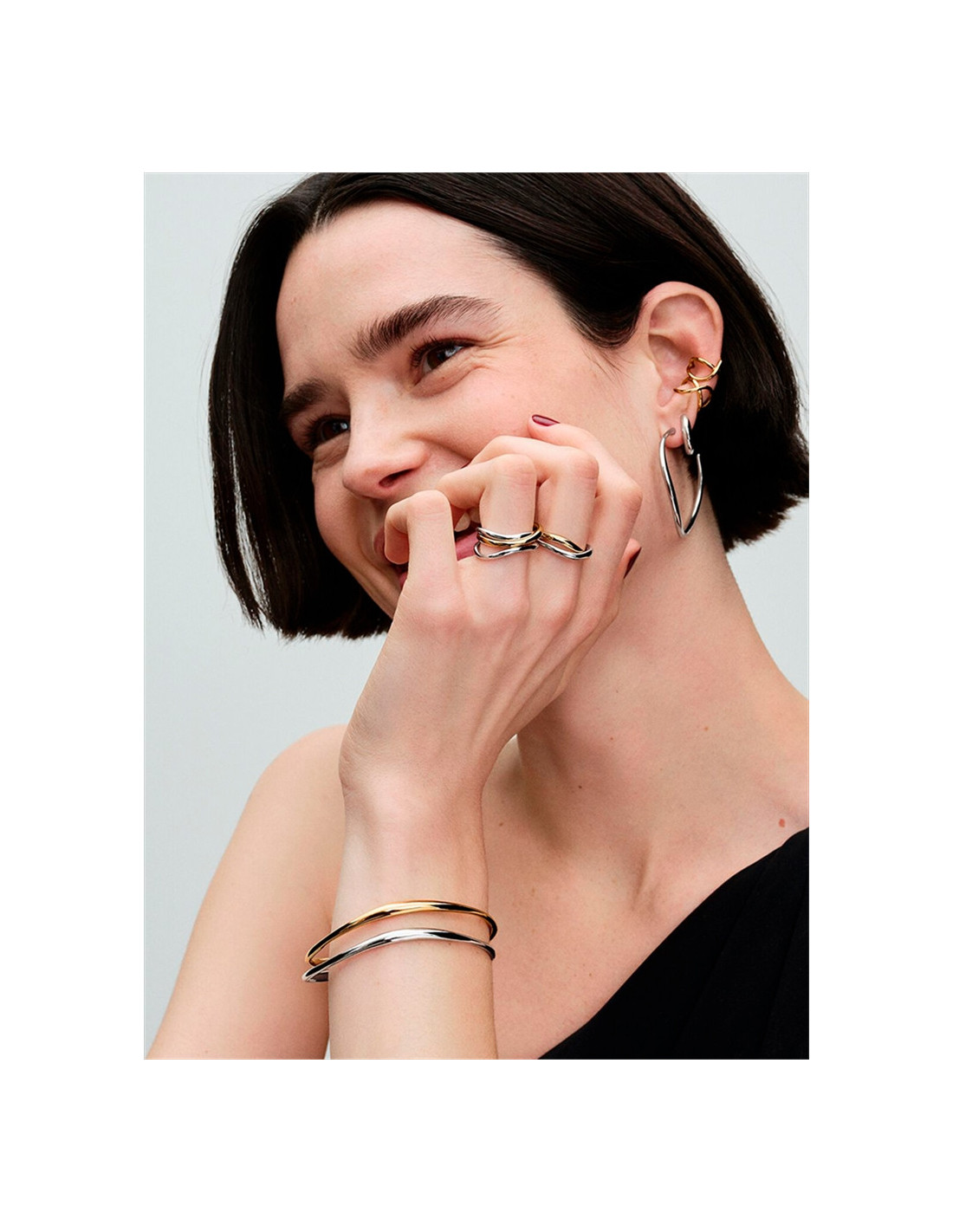 Una nueva interpretación de un clásico. En este anillo, dos bandas redondeadas y ligeramente onduladas, una en plata de primera ley y otra con un recubrimiento en oro de 14k, se superponen e interconectan entre sí. ¿Lo mejor de este diseño elegante y escu