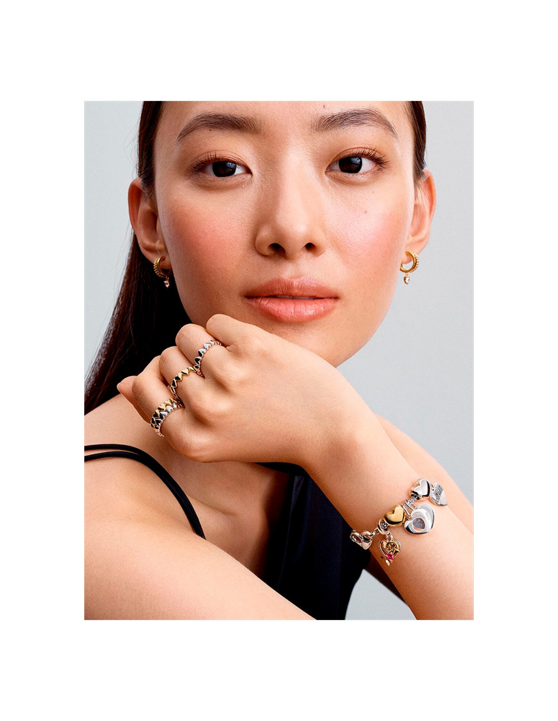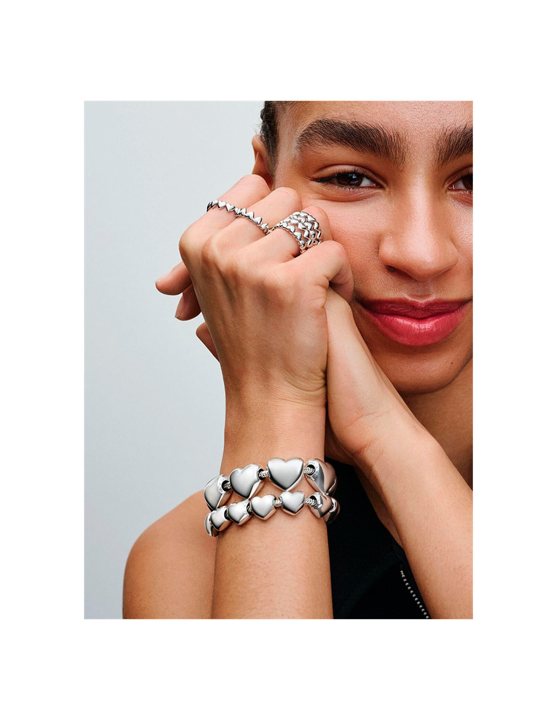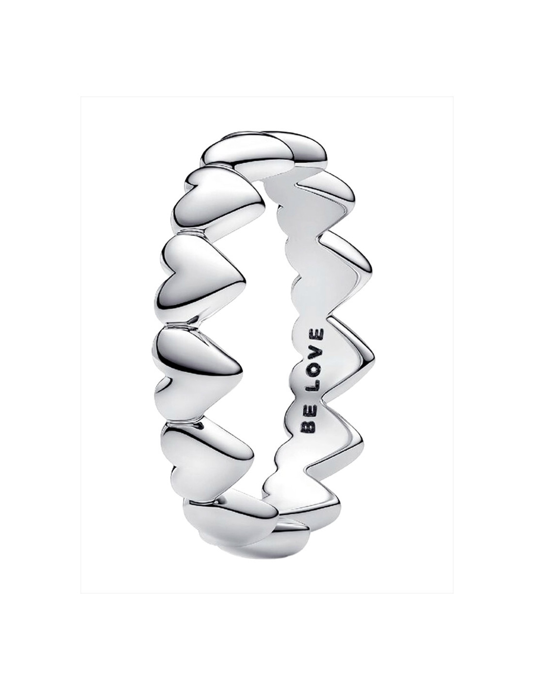 Este anillo en plata de primera ley es un regalo hecho con el corazón. Elaborado por expertos con una fila de corazones que forma la banda, este anillo queda igual de bonito solo o combinándolo con otros anillos de Pandora.