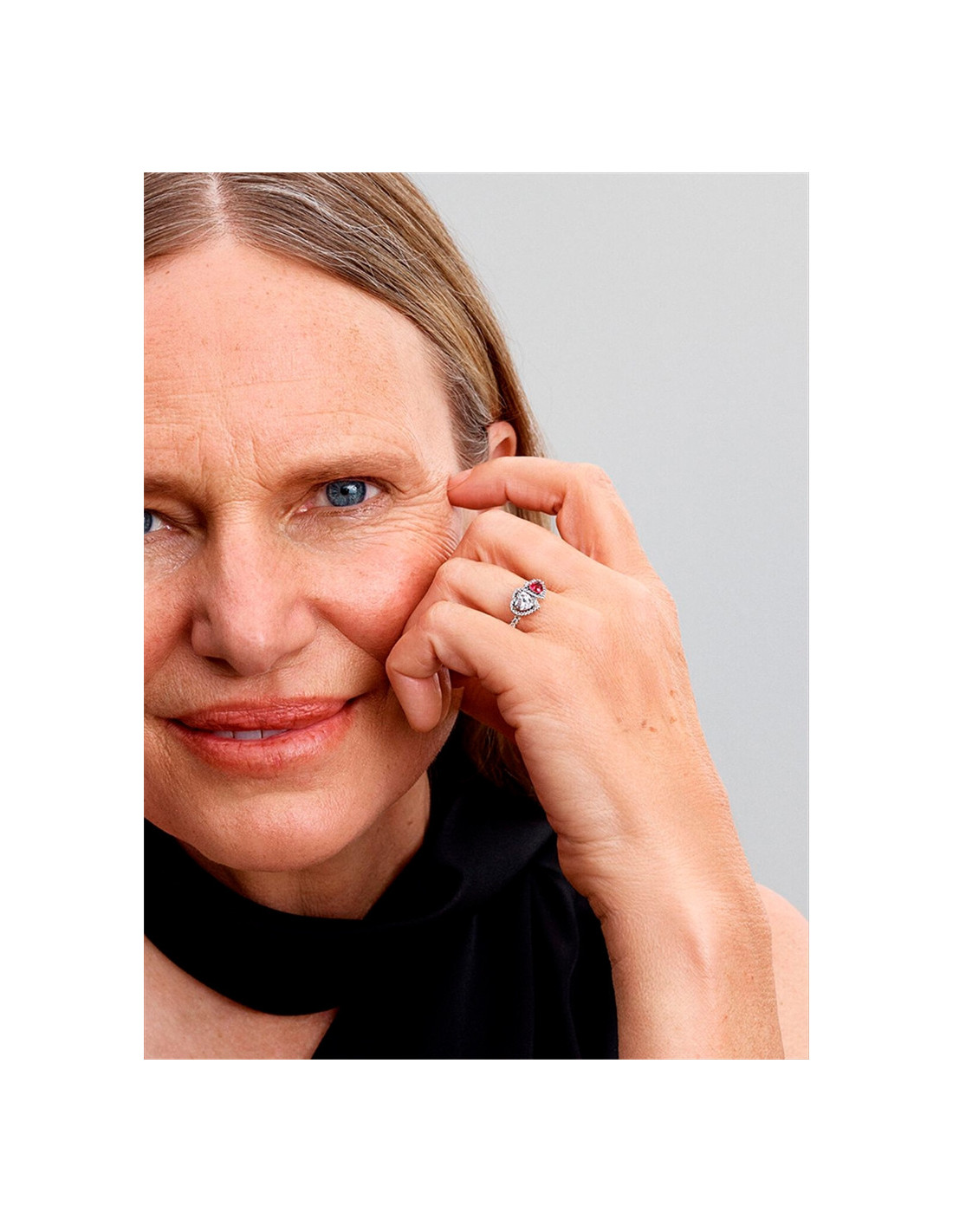 Este anillo de plata de primera ley se presenta con dos gemas con forma de corazón, una transparente y otra de vibrante color rojo, conectadas por un halo de brillante pavé. Este anillo con un eje extra brillante es un símbolo llamativo de amor y conexión