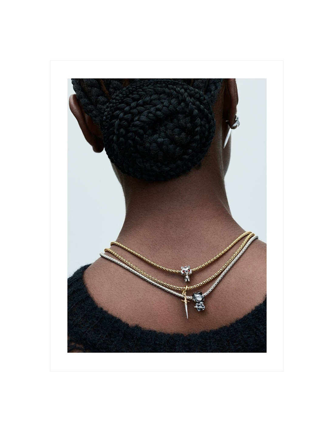 Lleva contigo la lealtad de tu casa con nuestro Charm Jon Snow de Juego de Tronos. Fabricado en plata de primera ley, el charm representa a Jon Snow con sus rasgos característicos, incluyendo la cicatriz en el ojo izquierdo, el bigote, su cabello rizado oscuro y su icónica capa con piel alrededor del cuello. Los detalles se resaltan con esmalte aplicado a mano que aporta profundidad de color. También lleva una espada con la cabeza de un lobo, el sello de lealtad y valor de su familia. Llévalo para apoyar al Rey del Norte o regala este charm de Juego de Tronos x Pandora a alguien especial.