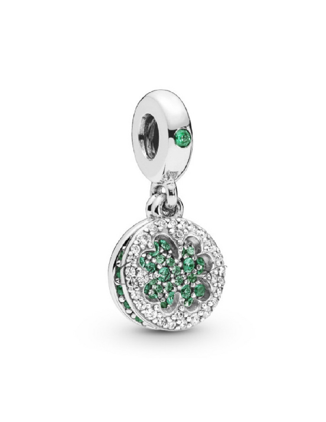 Charm colgante Pandora Trébol Brillante en plata de primera ley, adornado con circonitas cúbicas transparentes, cristales verdes y grabado “Anything is possible”.