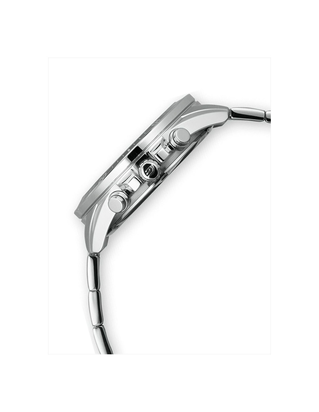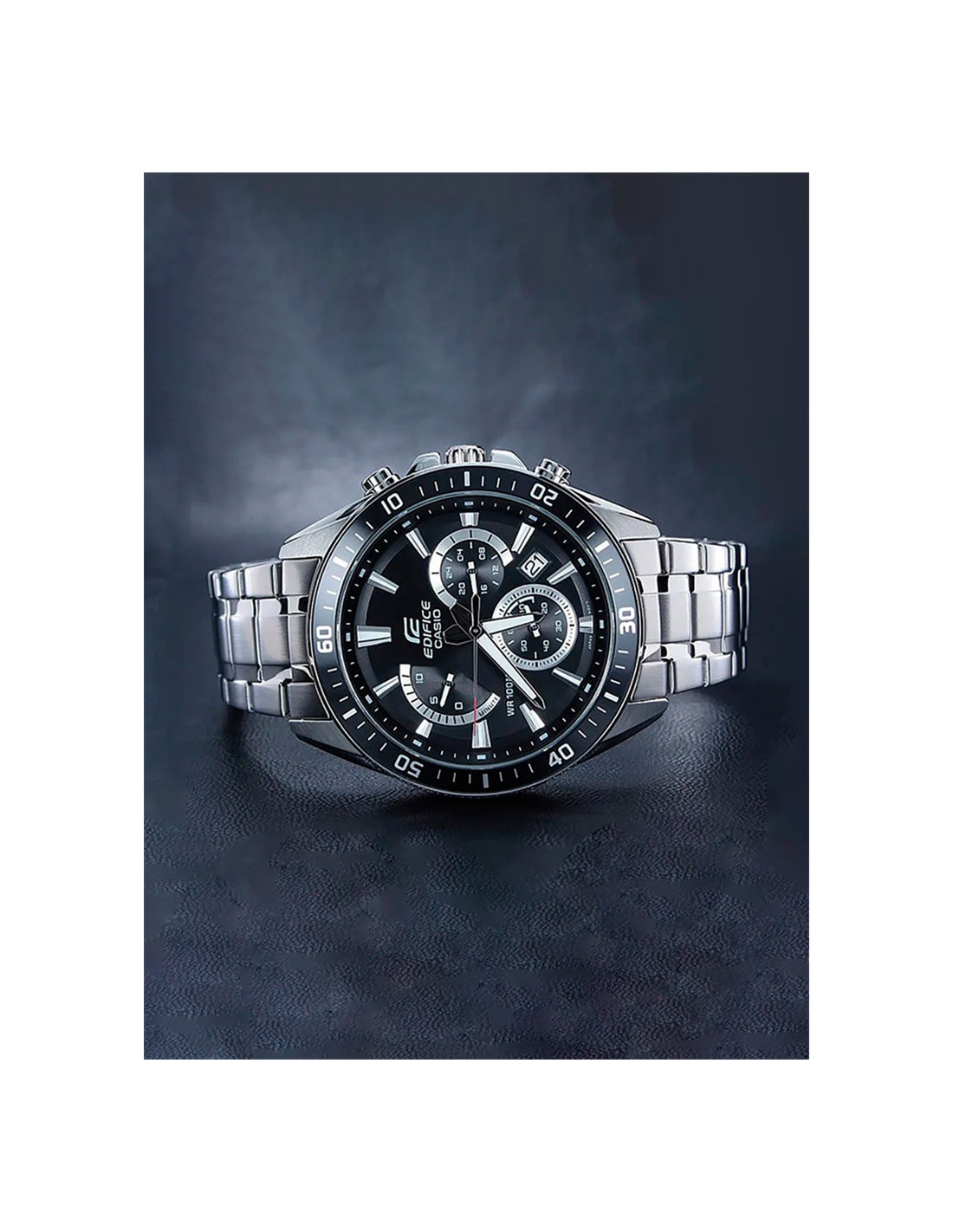 A continuación, le detallamos las características más importantes de este Casio Edifice. El color de la esfera, que es la zona más llamativa del reloj, es de color negro y su diámetro lo clasificamos como grande (+42 mm). El material de la correa del reloj Casio Edifice es de acero. Esta unidad Casio Edifice tiene una resistencia al agua de 10 Atm.