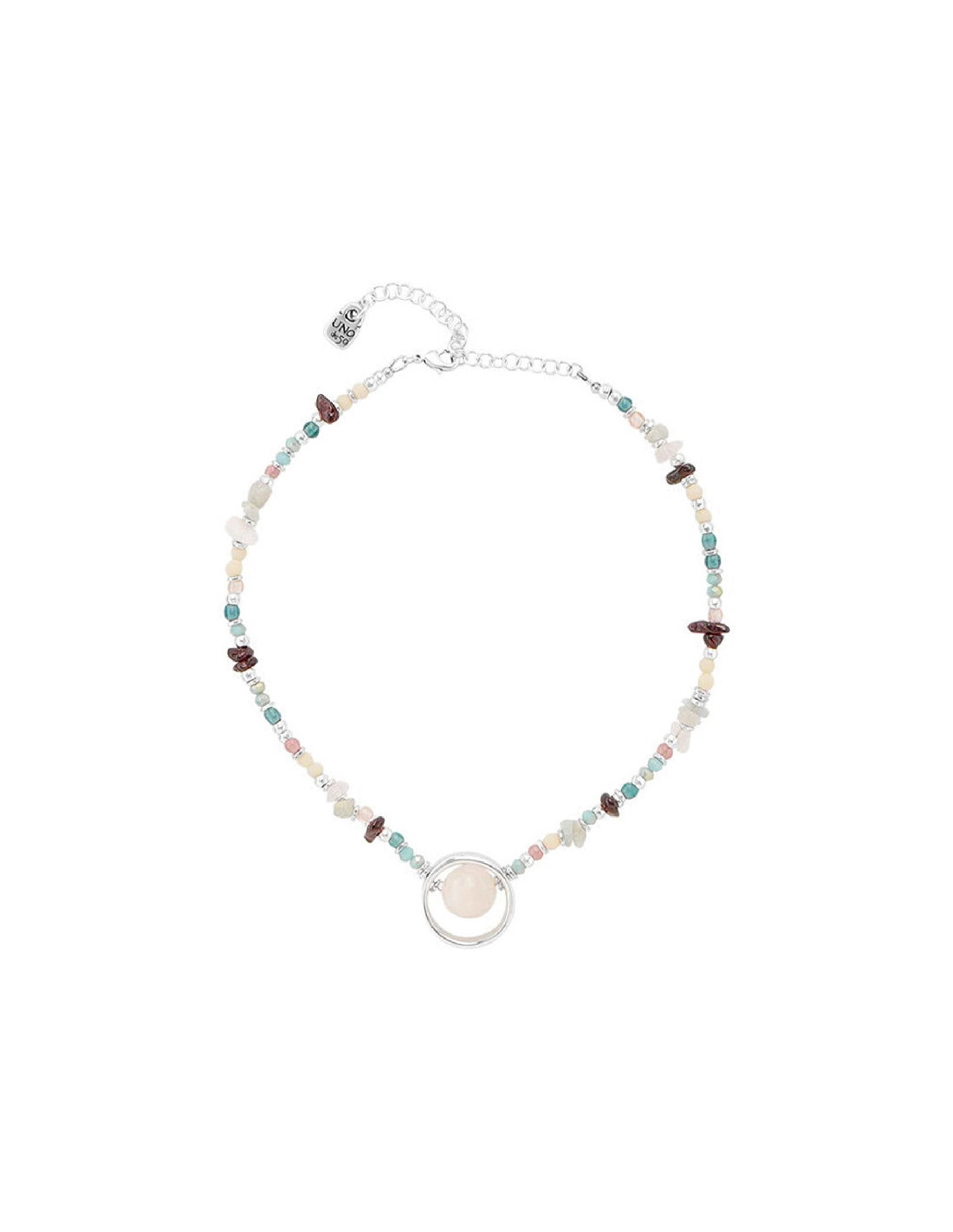 Colgante corto en aleación de metales bañados en plata y cristales artesanales.