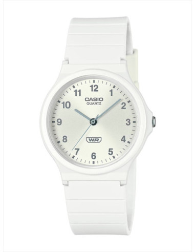 A continuación, le detallamos las características más importantes de este Casio Collection. El color de la esfera, que es la zona más llamativa del reloj, es de color blanco y su diámetro lo clasificamos como pequeño (-32 mm). El material de la correa del reloj Casio Collection es de resina. Esta unidad Casio Collection tiene una resistencia al agua de Water Resist.