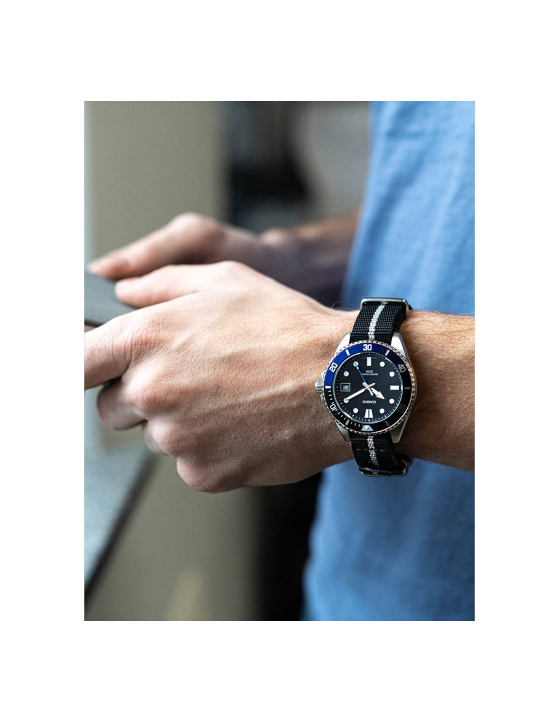 A continuación, le detallamos las características más importantes de este Casio Collection. El color de la esfera, que es la zona más llamativa del reloj, es de color negro y su diámetro lo clasificamos como mediano (32 - 42 mm). El material de la correa del reloj Casio Collection es de textil. Esta unidad Casio Collection tiene una resistencia al agua de 5 Atm.