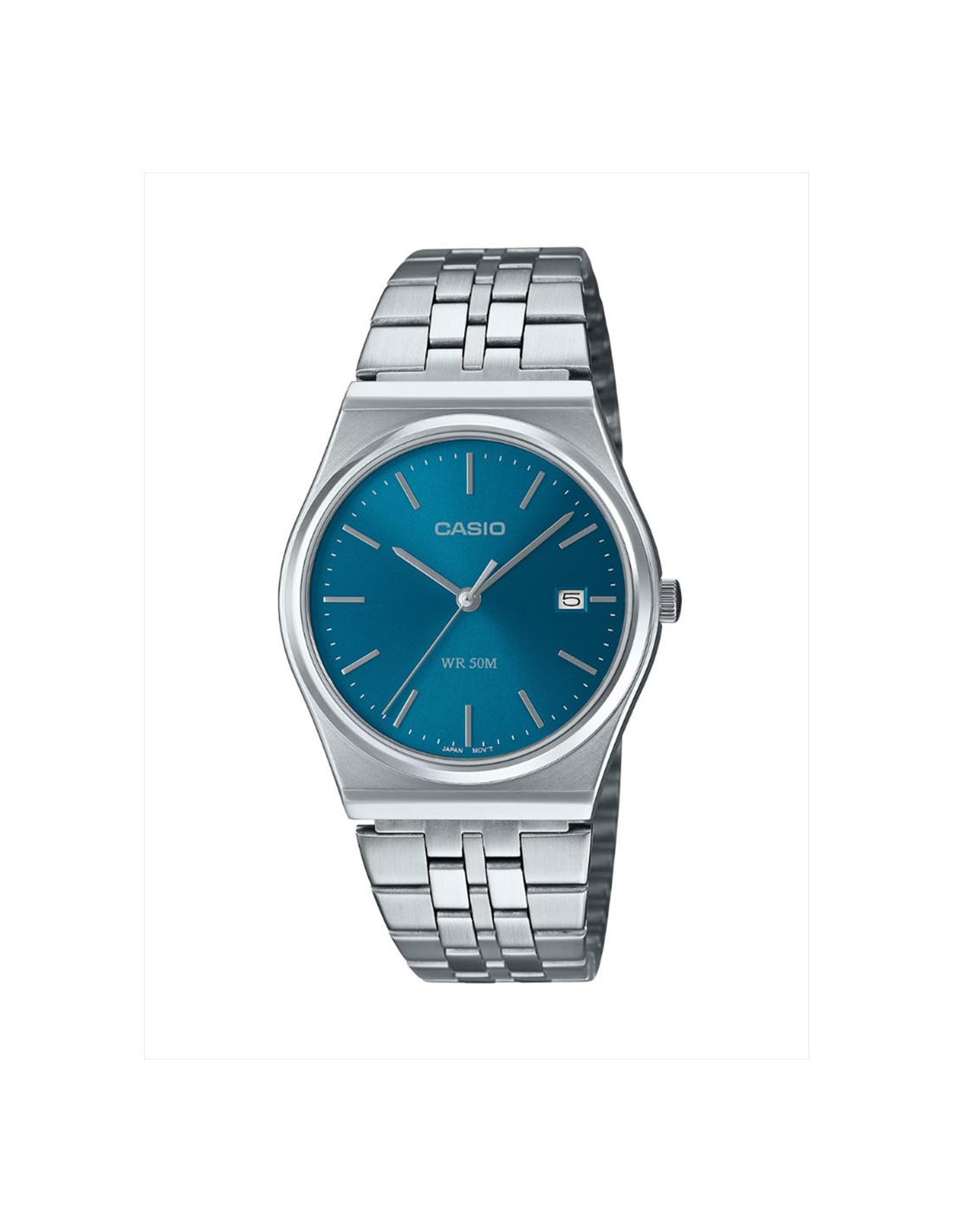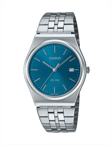 A continuación, le detallamos las características más importantes de este Casio Collection. El color de la esfera, que es la zona más llamativa del reloj, es de color azul y su diámetro lo clasificamos como mediano (32 - 42 mm). El material de la correa del reloj Casio Collection es de acero. Esta unidad Casio Collection tiene una resistencia al agua de 5 Atm.