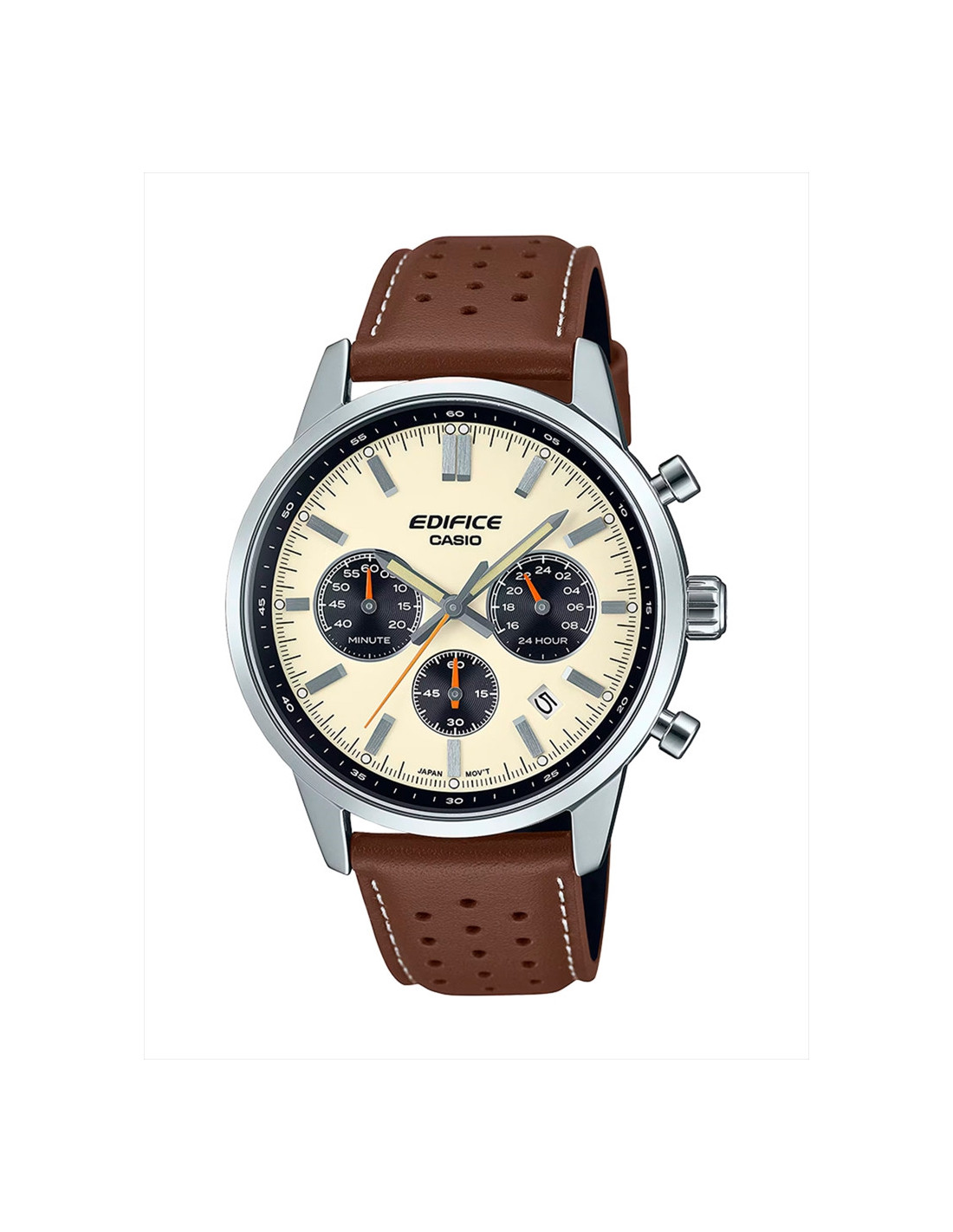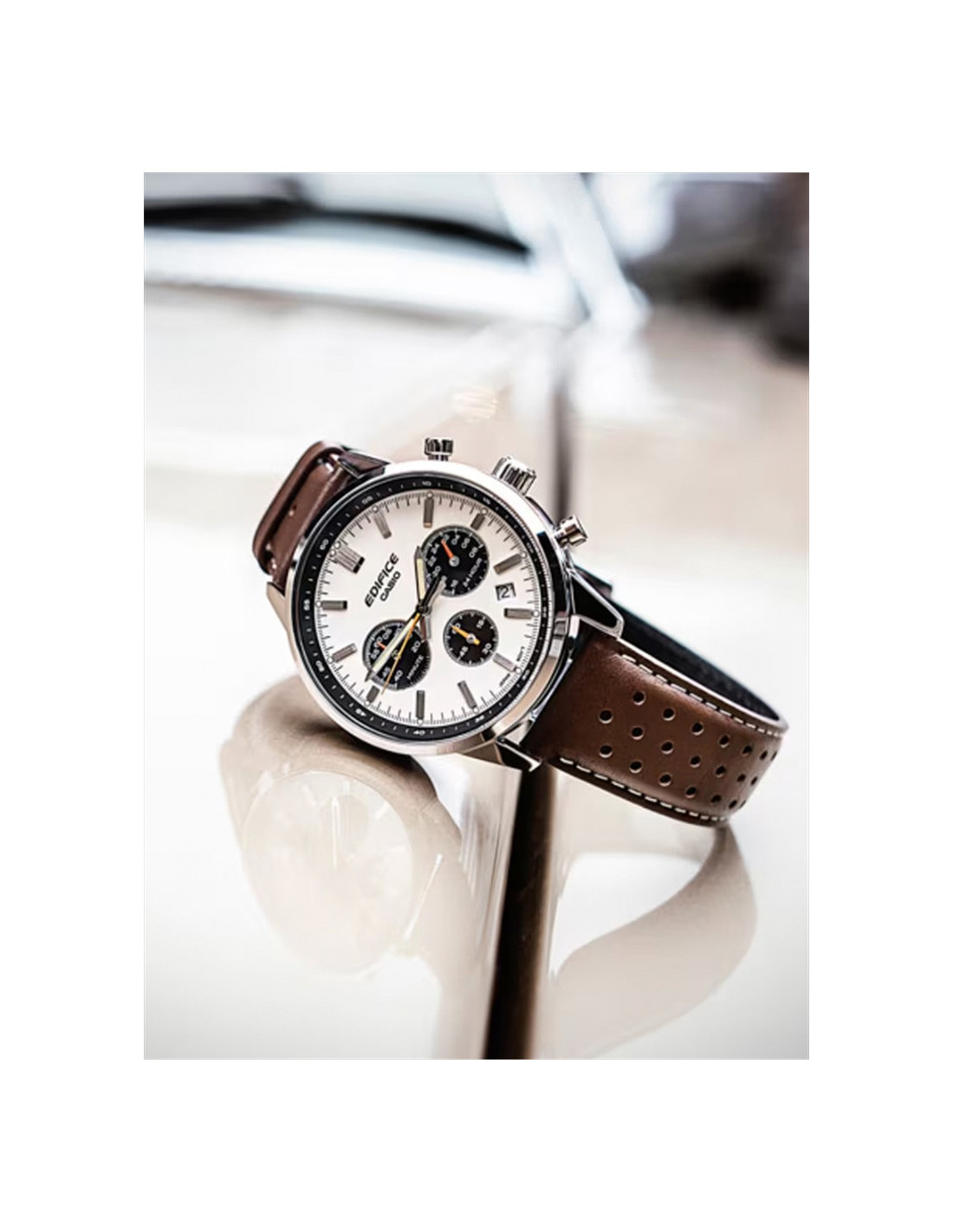 A continuación, le detallamos las características más importantes de este Casio Edifice. El color de la esfera, que es la zona más llamativa del reloj, es de color beige y su diámetro lo clasificamos como mediano (32 - 42 mm). El material de la correa del reloj Casio Edifice es de cuero. Esta unidad Casio Edifice tiene una resistencia al agua de 10 Atm.